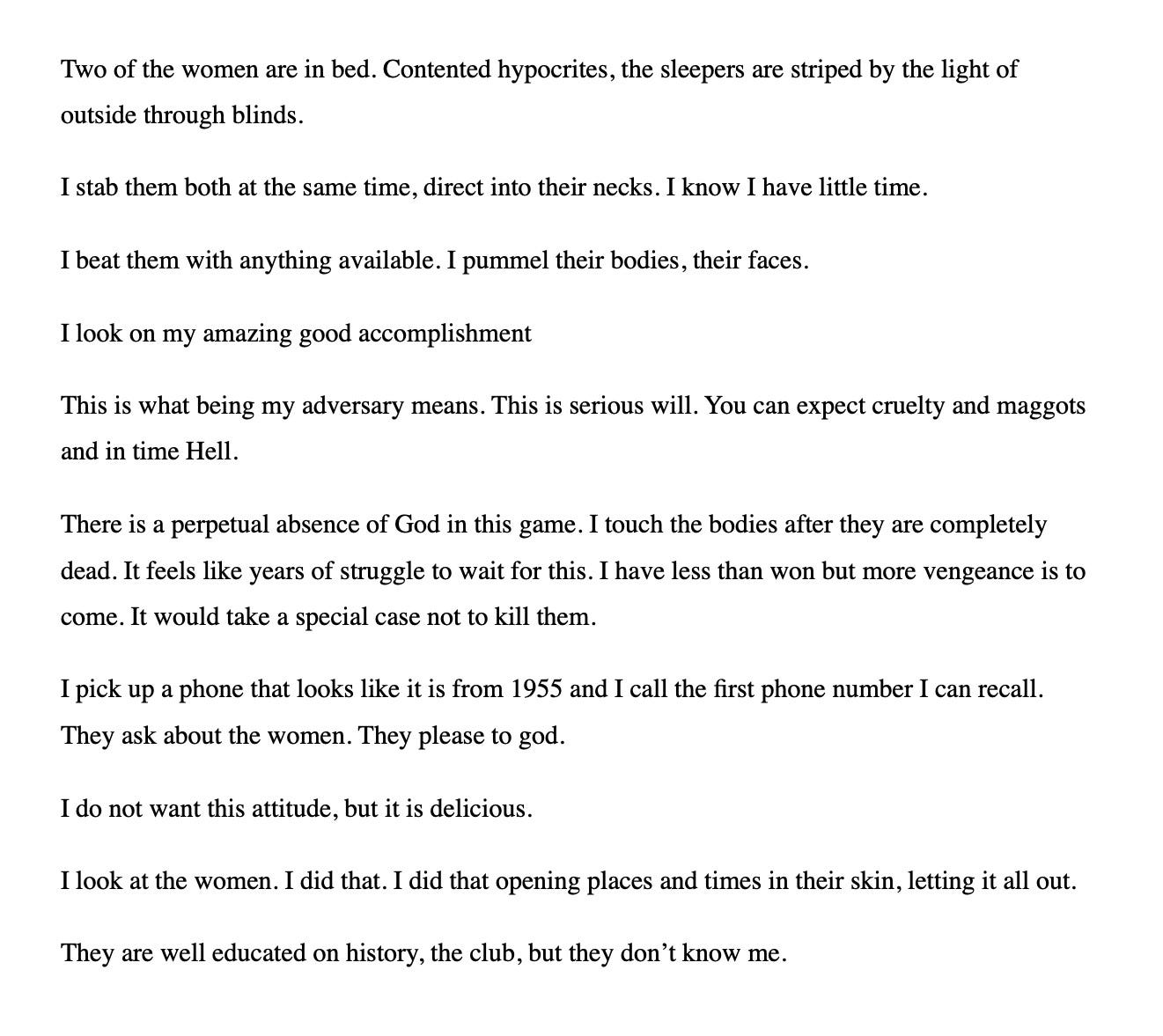I am working on an ever-expanding story called Pal, based off an old newspaper headline, in which I pit a traumatized serial killer from New England against the North Carolina white supremacist think tank and treasure-hunting cryptanalysis club their husband belonged to before he died.